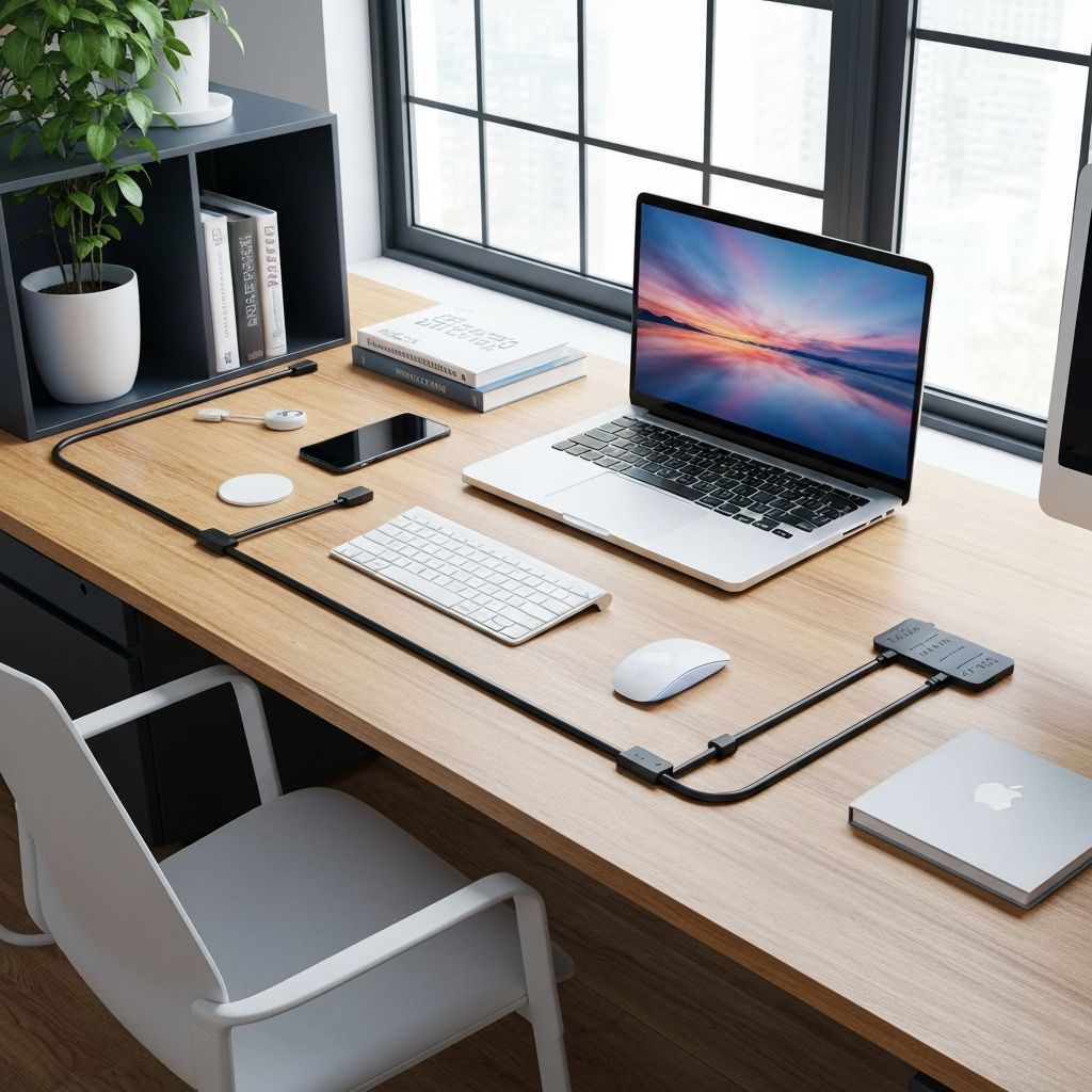 Desk accessories and cable-management solutions blending form, function, and clean workspace design.
